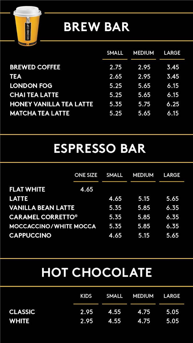 The menu at Second Cup is a delightful array of beverages and snacks designed to cater to various tastes. Whether you’re in the mood for expertly brewed tea at just CA$3.15 or want to indulge in a slice of the Cake of the Day for CA$9.25, there’s something here for everyone. For those seeking a savory treat, the Classic 3 Cheese Melt with Sundried Tomato Mayo (CA$8.45) and the Ham & Cheese Melt with Honey Mustard (CA$8.95) offer a perfect pick-me-up alongside your favorite drink.